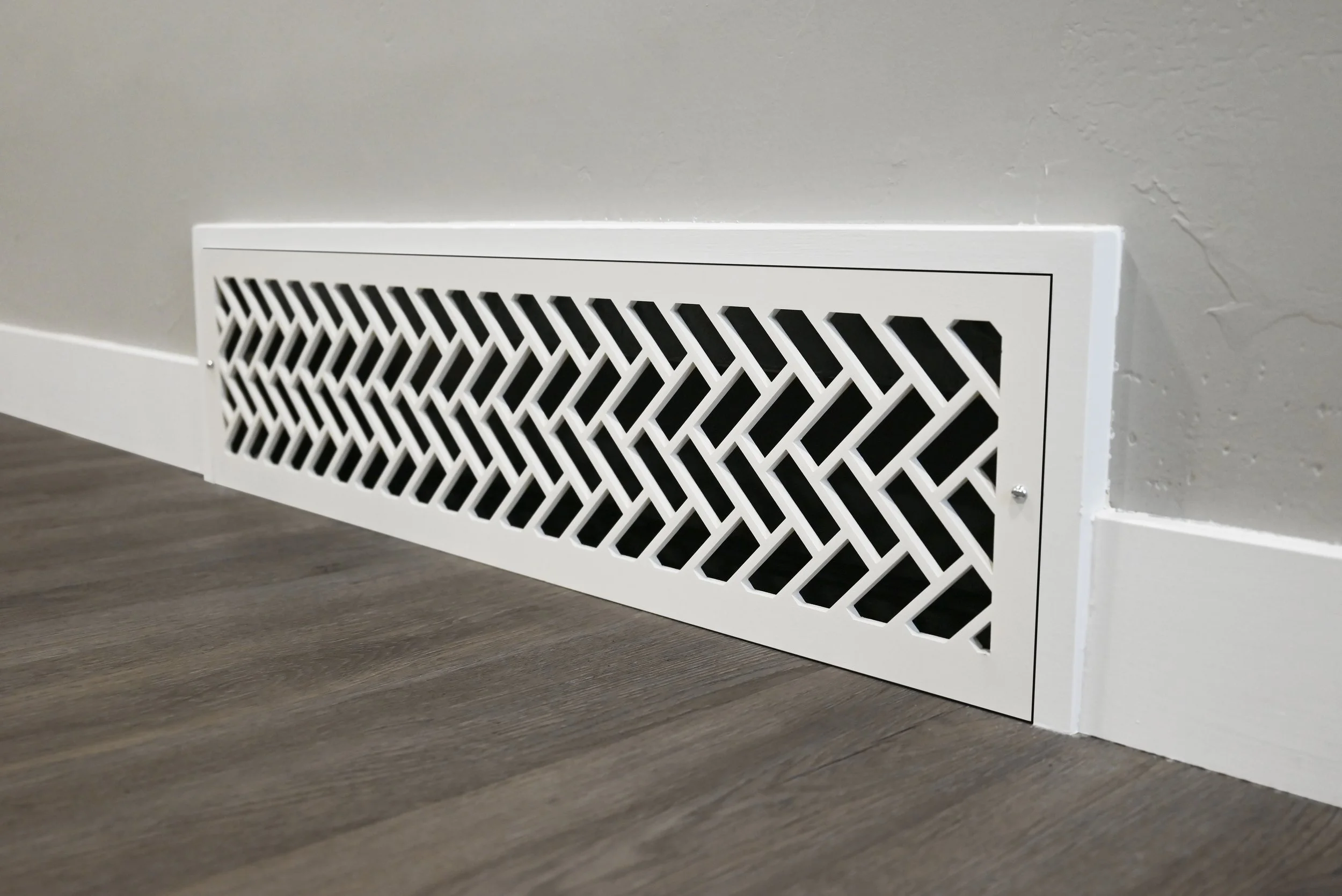 Baseboard vents and toe kick options are also available to support air returns and airflow in kitchens, cabinetry, and spaces where traditional floor registers are not ideal. This flexibility allows the Herringbone collection to maintain a cohesive, design-forward look throughout the space without compromising function.